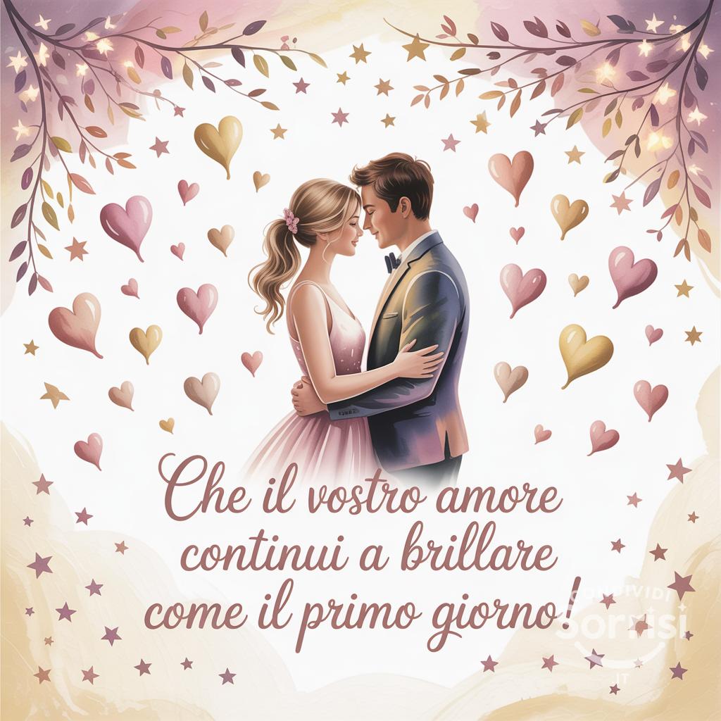 Anniversario: illustrazione romantica con cuori e frase "Che il vostro amore sia sempre più forte e splendente!". Auguri di anniversario, colori pastello, dettagli scintillanti.