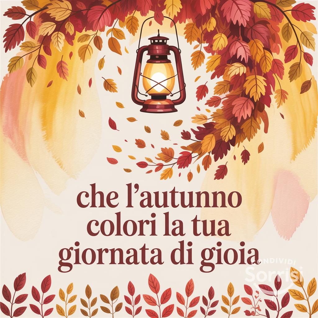 Autunno magico: Immagine realistica con colori caldi e luce soffusa. La frase "Lasciati avvolgere dall'autunno, un abbraccio di calore e magia!" evoca l'atmosfera autunnale perfetta.