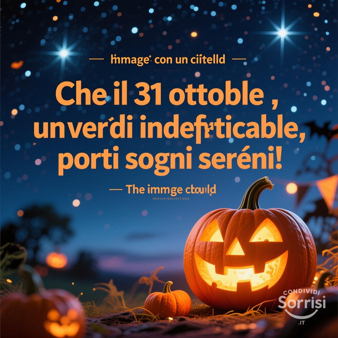 Immagine Halloween con zucca e cielo stellato. Frase augurale "Che il 31 ottobre... porti sogni sereni!" Font moderno, colori caldi. Atmosfera festosa e accogliente. Buon Halloween!