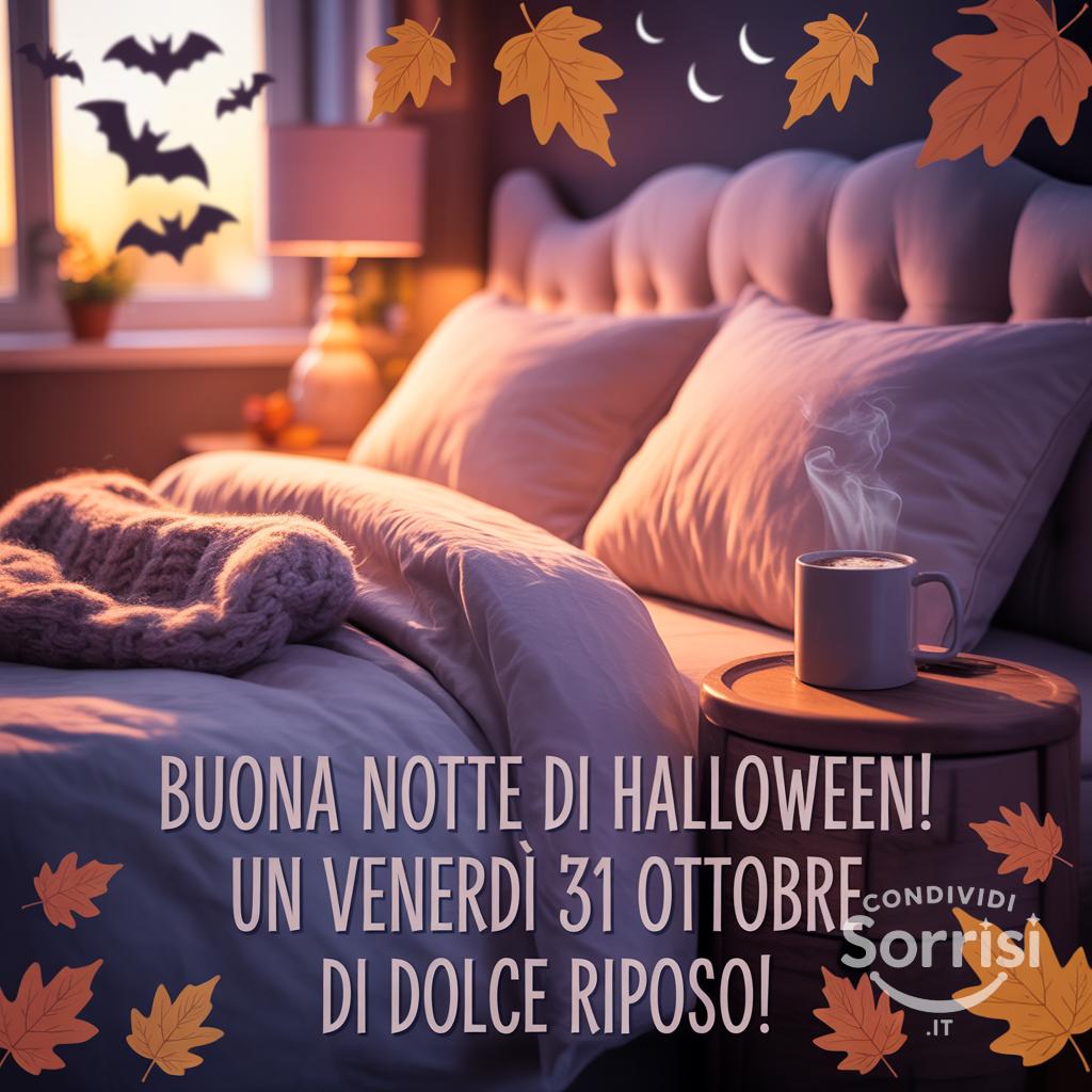 Dolce notte di Halloween! 🎃✨ Un venerdì 31 ottobre all'insegna del relax. Rilassati sotto le coperte con una tazza fumante. Sogni d'oro! 😴🌙 #Halloween #Buonanotte #Relax #Venerdi31