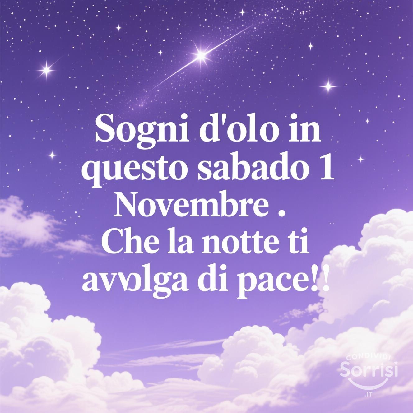 Immagine: "Sogni d'oro" 1 novembre. Cielo stellato, nuvole, pace notturna. Frase serena, colori viola e bianco. Design rilassante per augurare buonanotte e un felice sabato.