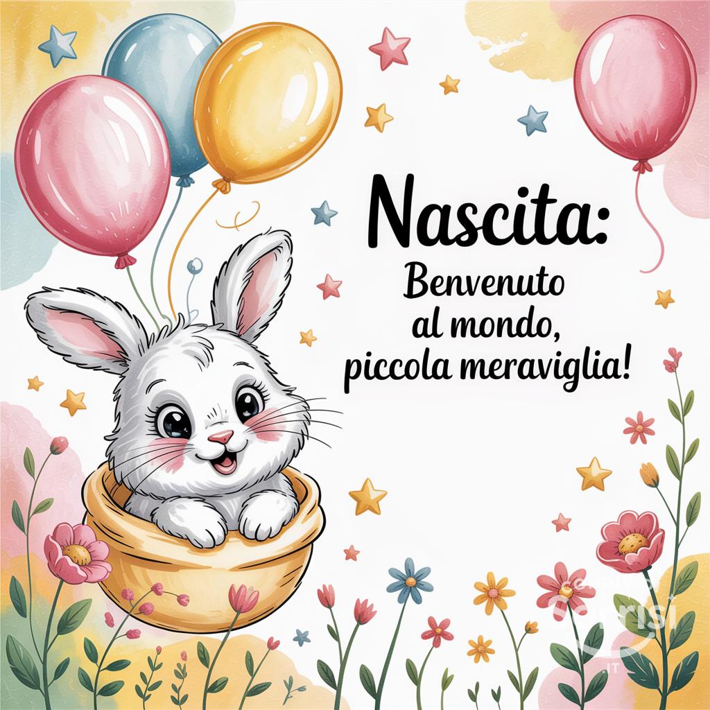 Nascita Battesimo: illustrazione acquerello delicata "Benvenuto/a al mondo, che la felicità ti accompagni!". Grafica colori pastello, ideale per biglietti auguri e decorazioni.