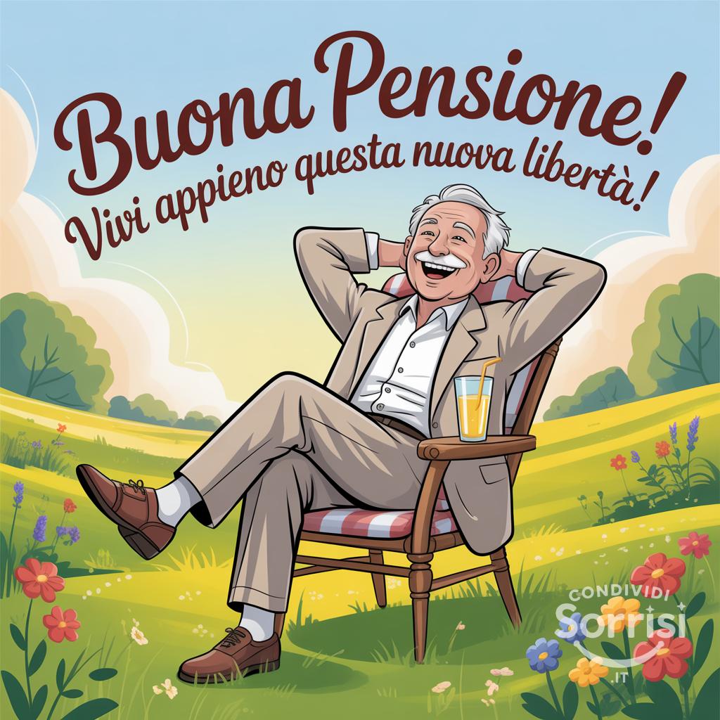 Buona pensione! Immagine allegra: "Buona pensione! Vivi appieno questa nuova libertà!" con anziano felice, stile cartoon, colori vivaci e soleggiato. Ideale per auguri pensione e celebrare la libertà.