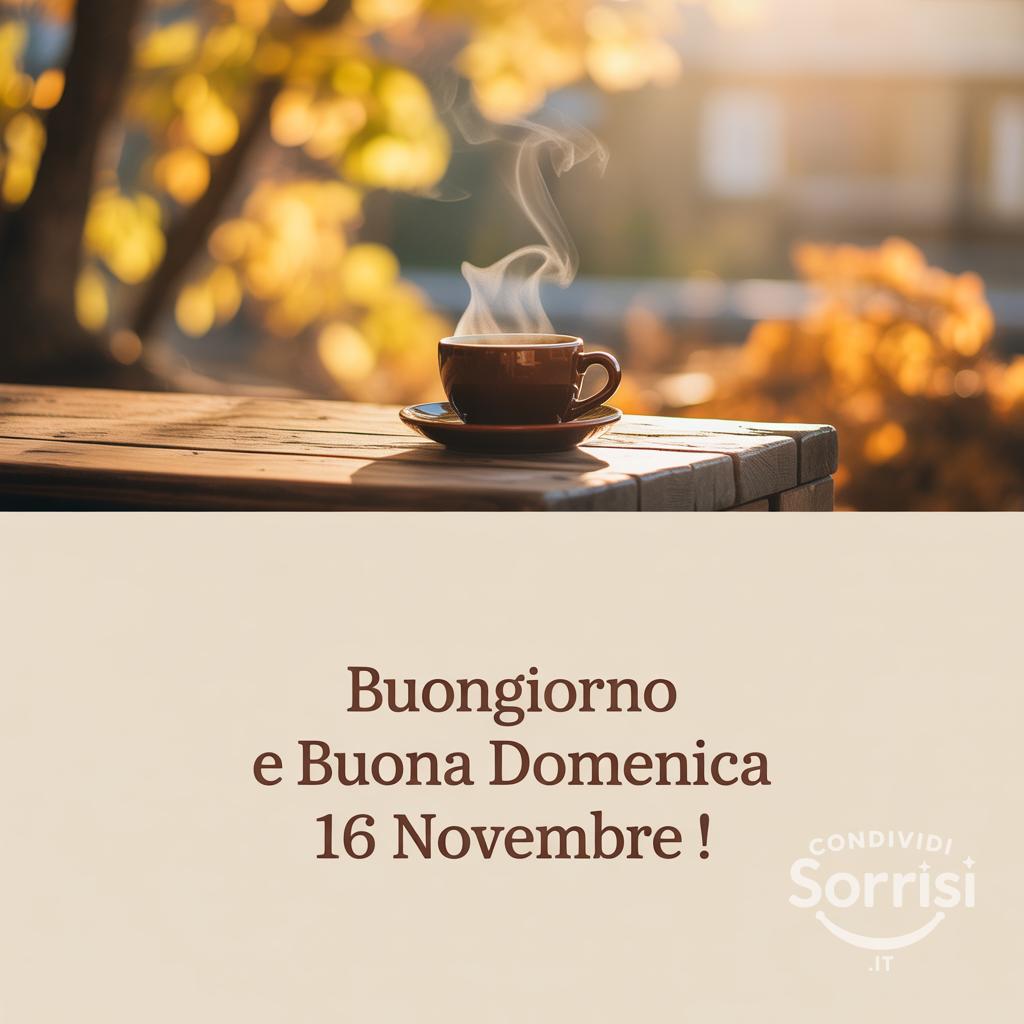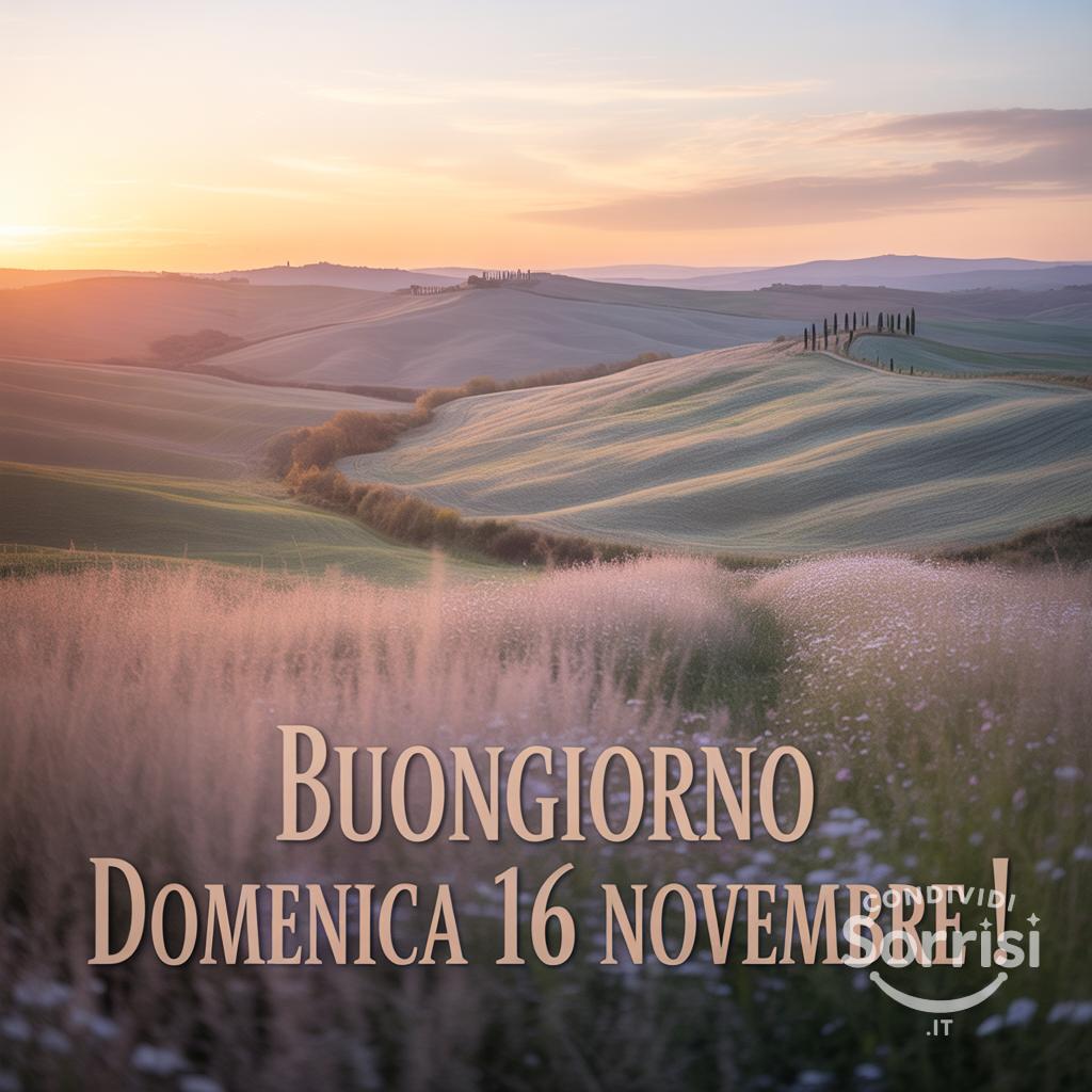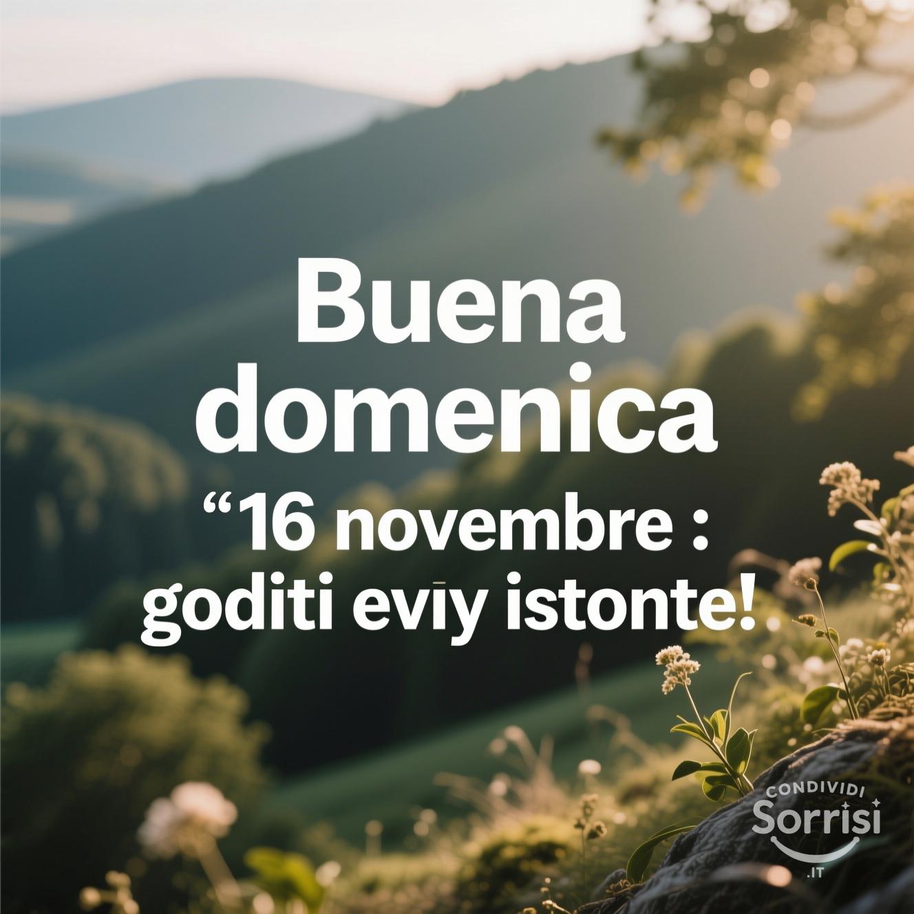 Buona Domenica 16 Novembre! Immagine motivazionale con frase positiva. Sfondo naturale, stile moderno e semplice per un augurio speciale. Goditi ogni istante!