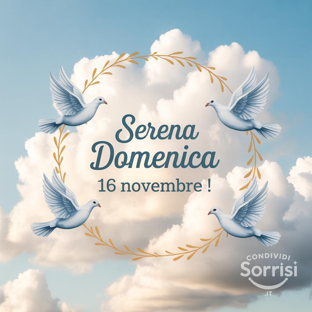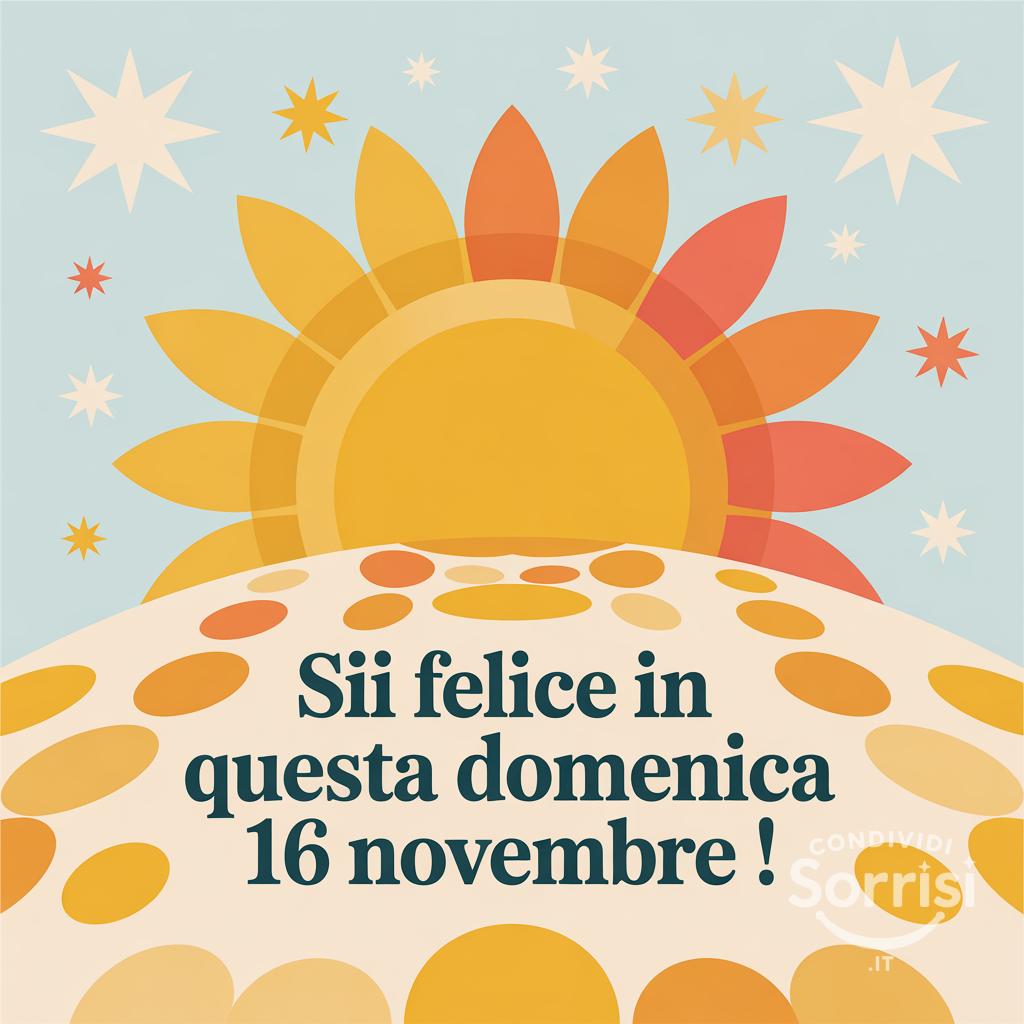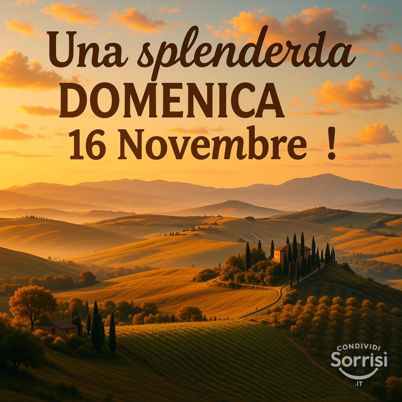Buona Domenica 16 Novembre! Immagine motivazionale con frase positiva. Sfondo naturale, stile moderno e semplice per un augurio speciale. Goditi ogni istante!