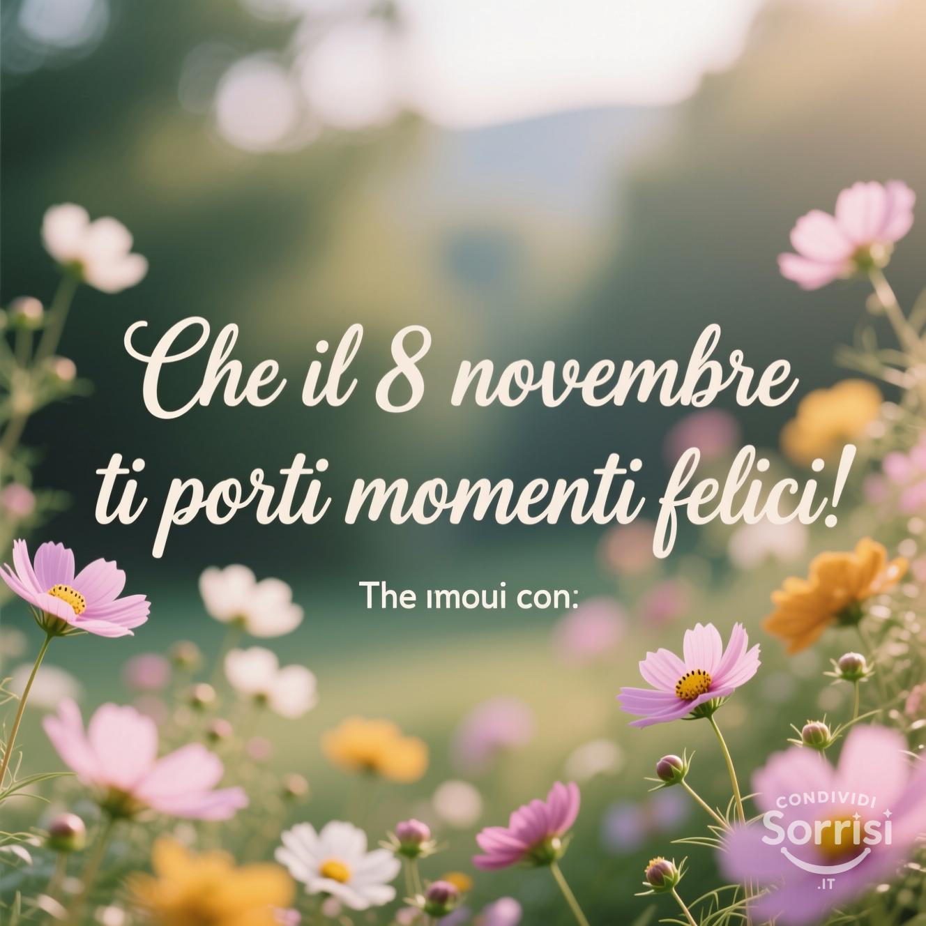 Immagine di auguri 8 novembre con fiori e colori pastello. Frase delicata: "Che l'8 novembre ti porti momenti felici!". Sfondo naturale. Biglietto d'auguri personalizzato, design floreale.
