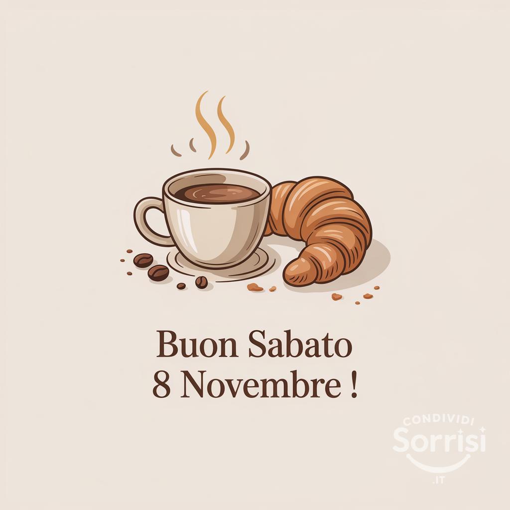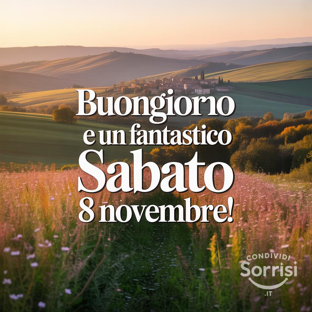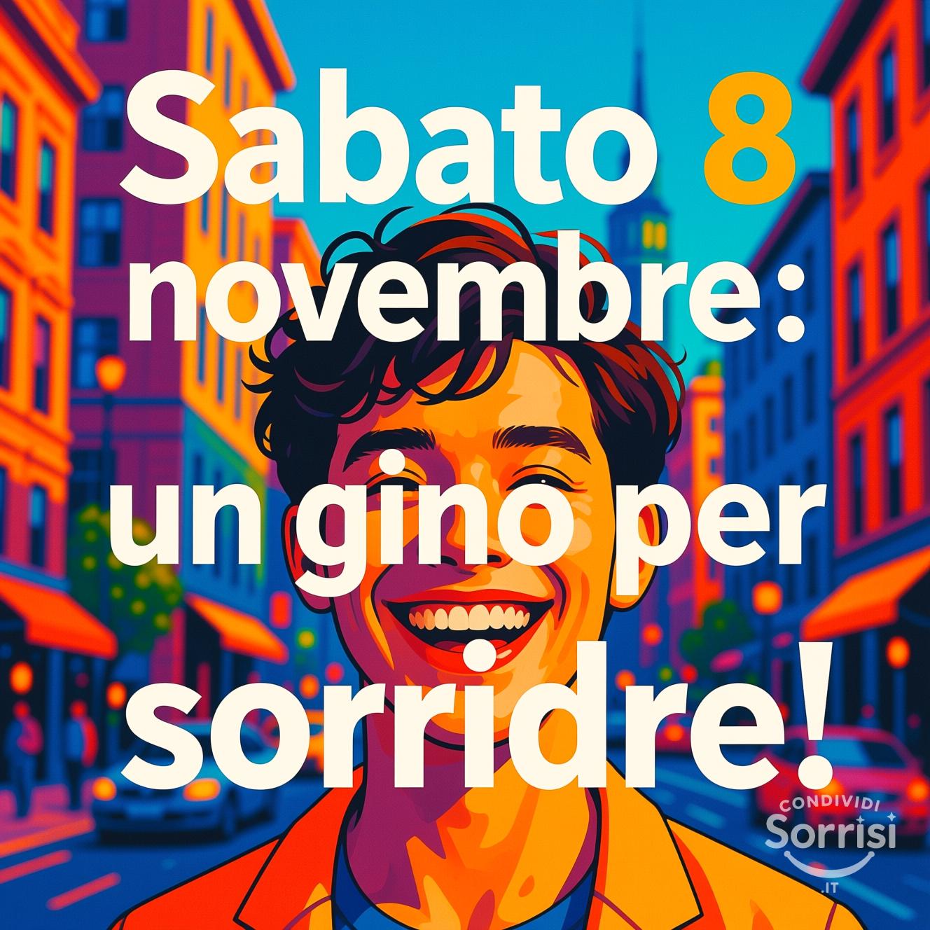 Sabato 8 novembre: un giorno per sorridere! Immagine con frase motivazionale su sfondo urbano. Stile moderno e colori vivaci. Ottimizzato per SEO: sorriso, felicità, novembre, giornata positiva.