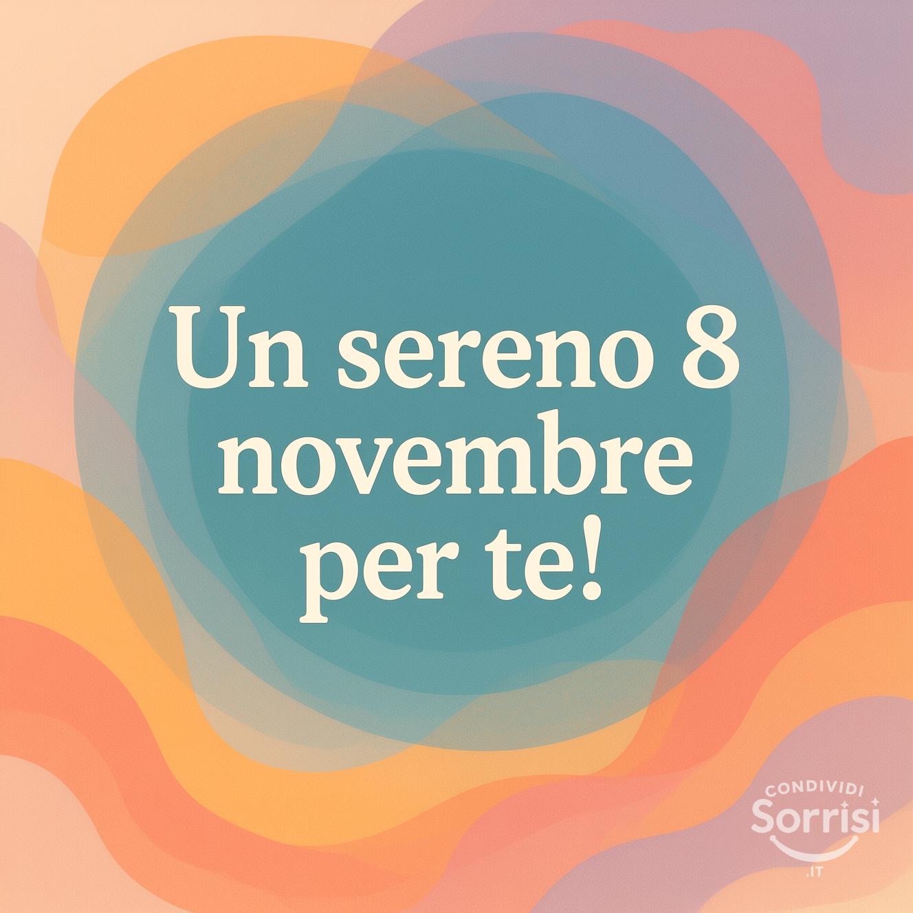 Immagine 8 novembre sereno. Auguri! Grafica astratta con colori rilassanti e frase minimalista "Un sereno 8 novembre per te!". Design moderno, perfetto per auguri online.