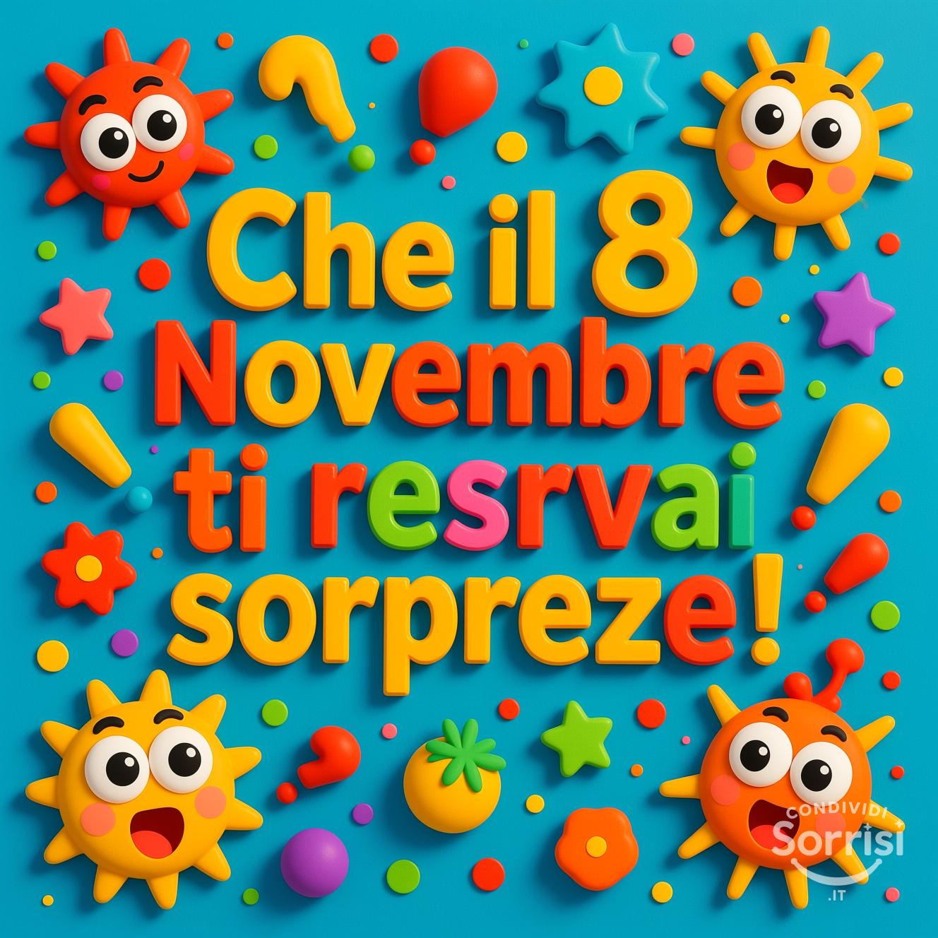 "Immagine auguri 8 novembre! Frase sorpresa stile giocoso, colori vivaci. Auguri originali per la giornata, design allegro e creativo. SEO keywords: auguri, novembre, sorpresa, giocoso, design"