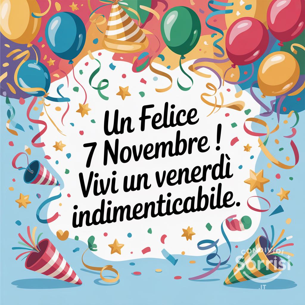 🎉 Un felice 7 novembre! ✨ Vivi un venerdì indimenticabile! 🥳 Un'esplosione di colori e gioia per iniziare al meglio il weekend! 🌈 Che la festa abbia inizio! 🎈