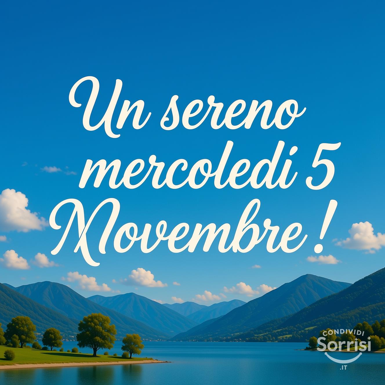 "Sereno mercoledì 5 novembre": immagine con sfondo blu, paesaggio rilassante e scritta elegante. Perfetta per augurare un buon mercoledì con stile e tranquillità.