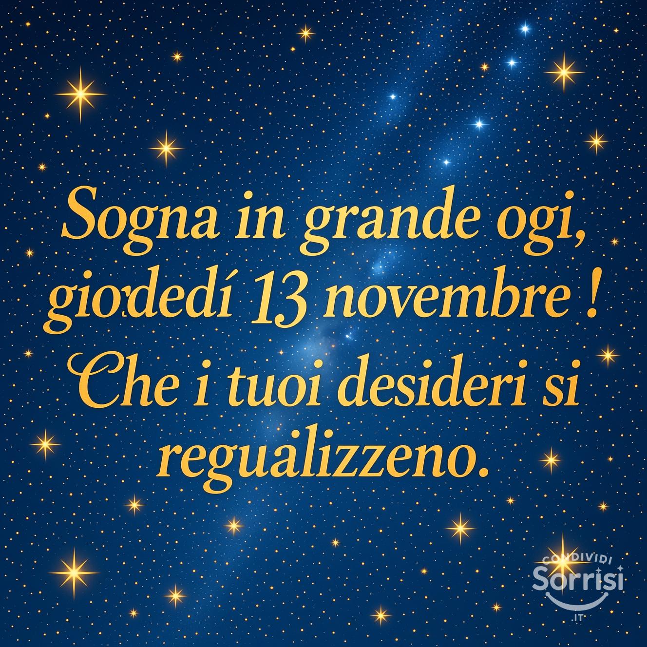 Immagine romantica con frase motivazionale. Sfondo stellato blu e oro, font elegante. "Sogna in grande oggi, giovedì 13 novembre! Che i tuoi desideri si realizzino." Perfetta per ispirazione e auguri.