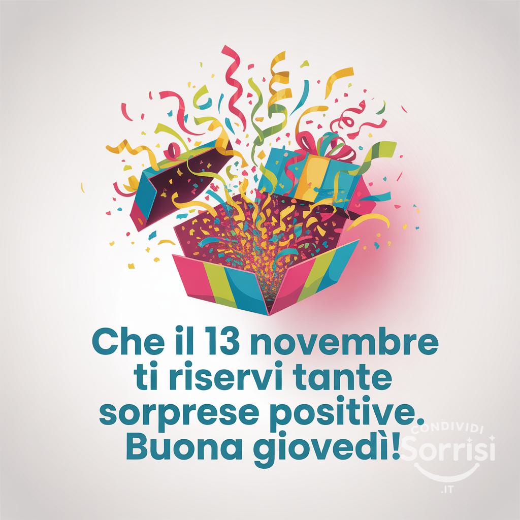 Un giovedì pieno di sorprese positive! ✨ Che il 13 novembre ti porti gioia e felicità. Buona giornata! 🥳 #giovedì #sorprese #felicità #buonagiornata