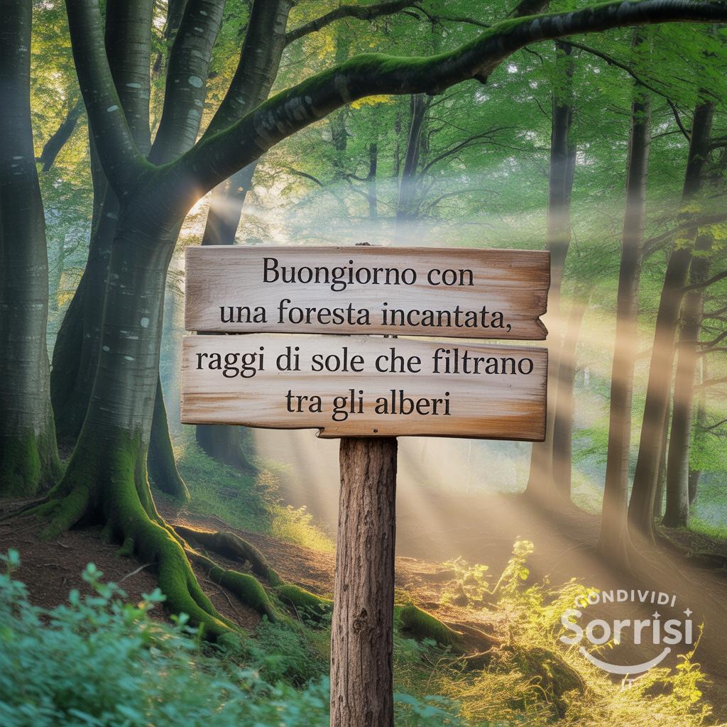 Buongiorno con una foresta incantata, raggi di sole che filtrano tra gli alberi