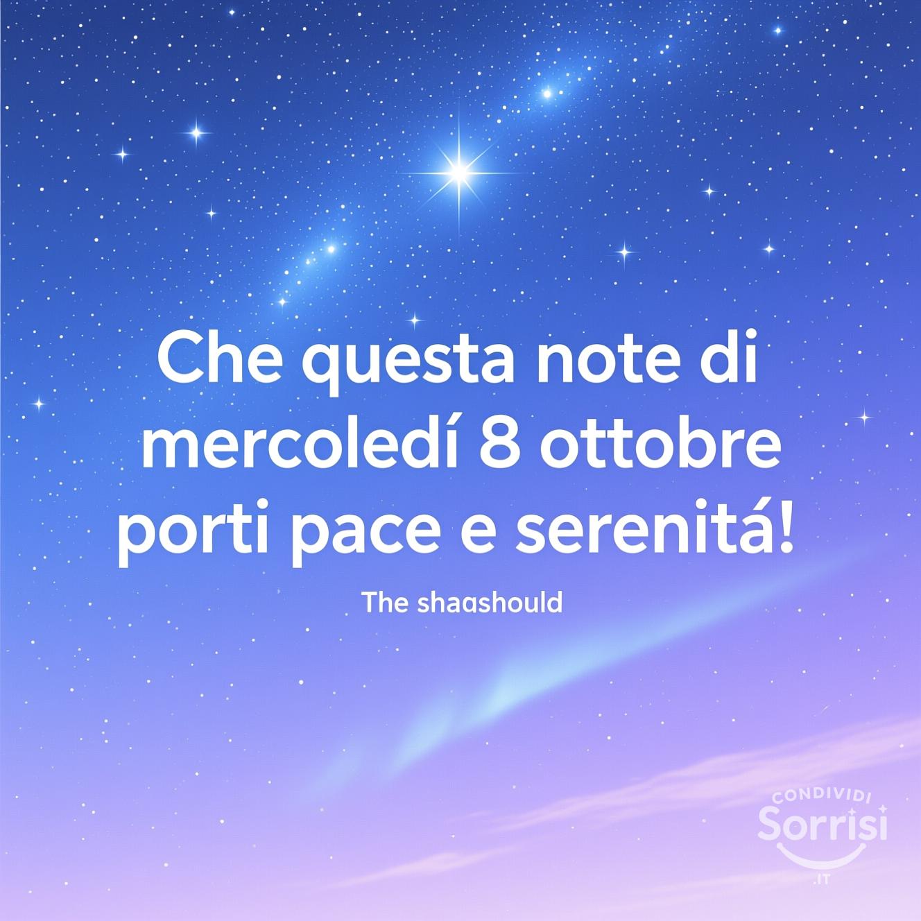"Serena notte di mercoledì 8 ottobre ✨ Immagine cielo stellato con frase di pace e serenità. Design minimalista, colori rilassanti (blu, viola) e luce soffusa. Auguri e buonanotte."