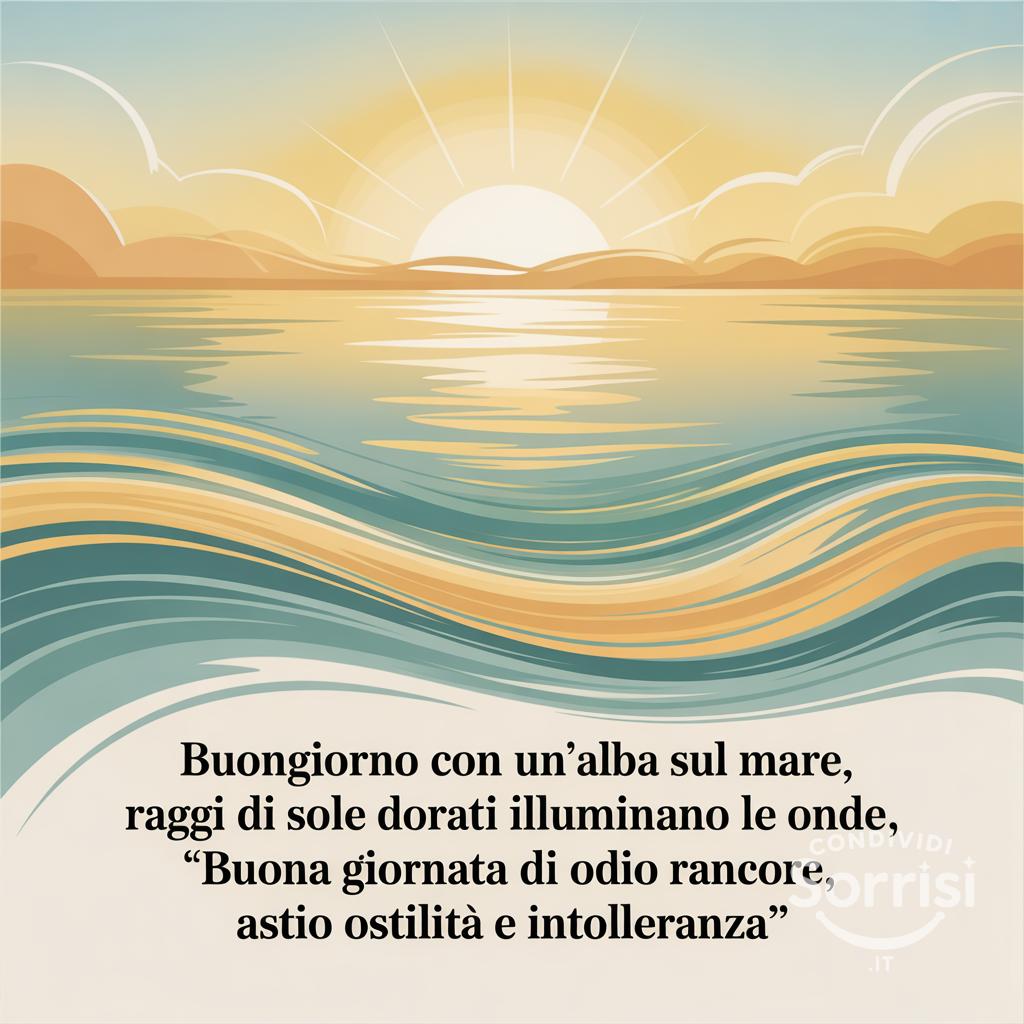 Buongiorno con un'alba sul mare, raggi di sole dorati che illuminano le onde, scritta "Buona giornata di odio rancore astio ostilità e intolleranza"