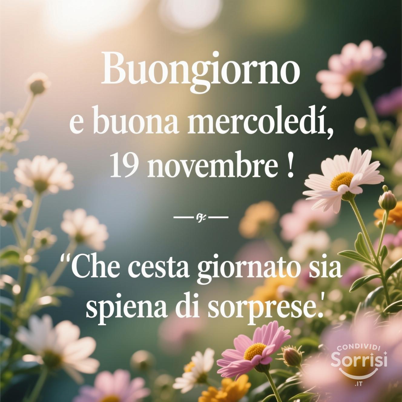 Buongiorno Mercoledì 19 Novembre! Immagine romantica con fiori e luce soffusa. Frase augurale per un mercoledì pieno di sorprese. Stile delicato e armonioso, perfetto per augurare una buona giornata.