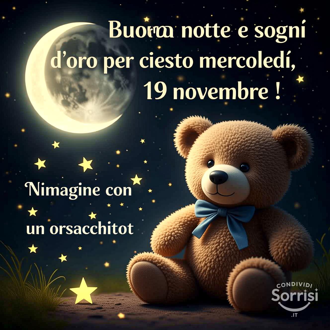 "Buonanotte e sogni d'oro! 🐻🌙⭐ Immagine per bambini con orsetto, luna e stelle. Mercoledì 19 novembre. Auguri serali dolci. Immagini buonanotte per bambini."
