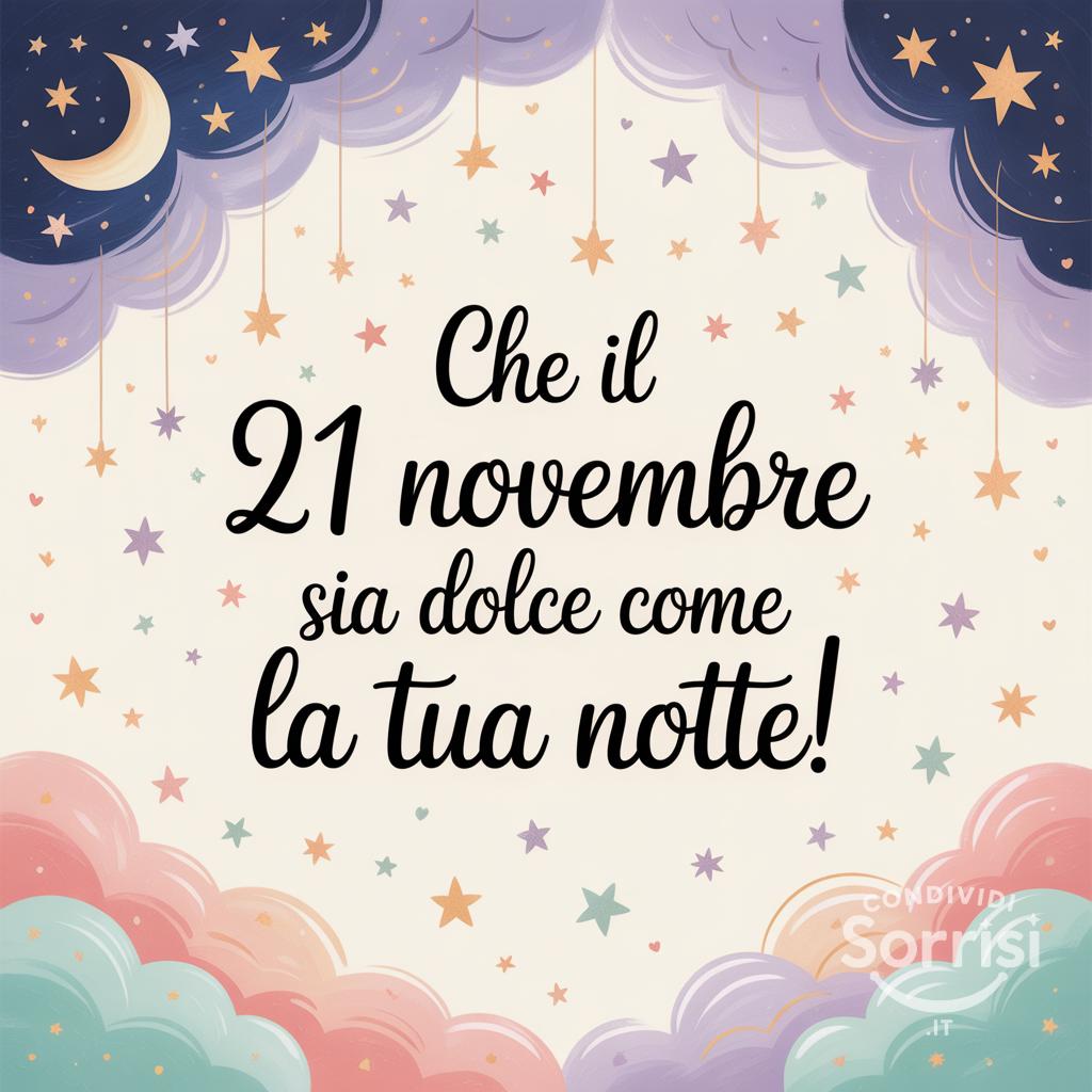 Che il 21 novembre sia dolce come la tua notte! ✨ Immagina questo cielo stellato... Un augurio speciale, scritto con il cuore. Buonanotte! 🌙 #novembre #sogni #notte #stellata #dolcisogni