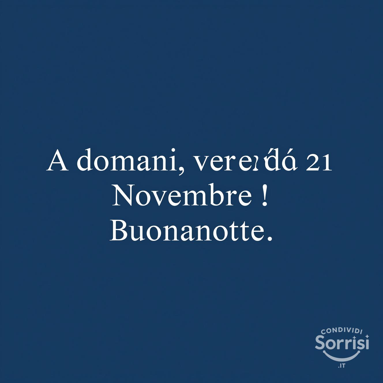 Immagine Buonanotte: "A domani, venerdì 21 novembre!" su sfondo blu scuro. Messaggio di buonanotte semplice e pulito, ideale per condividere gli auguri su social media. Testo chiaro e leggibile per un saluto serale.