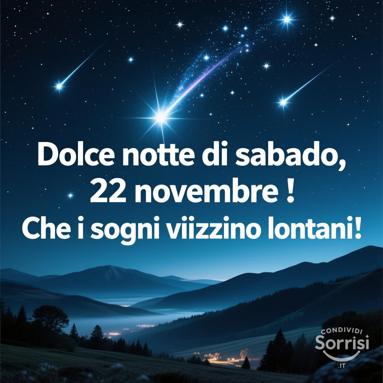 Immagine buonanotte sabato 22 novembre. Paesaggio notturno con stelle cadenti, colori freddi e luce soffusa. Frase dolce notte in grassetto. Relax e sogni d'oro.