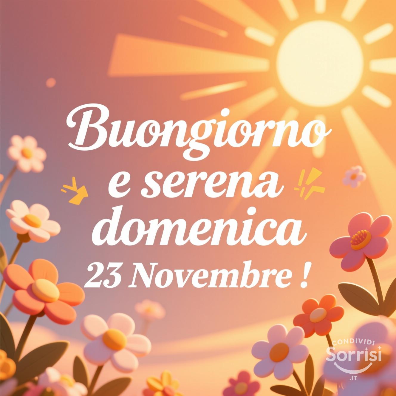 Buongiorno e serena domenica 23 novembre! Immagine con sfondo solare e colori caldi. Scritta elegante e accogliente con raggi di sole e fiori stilizzati. Stile moderno e positivo per una giornata speciale.