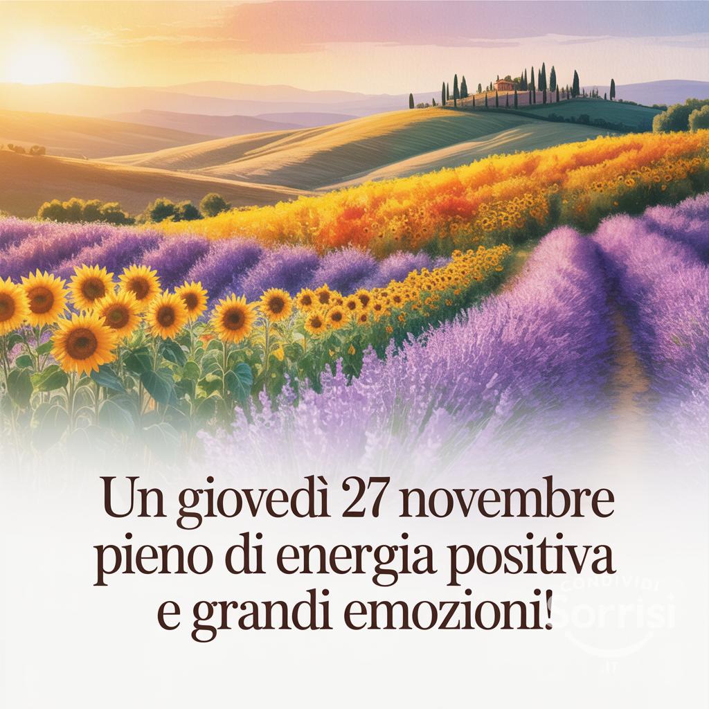 Un giovedì 27 novembre pieno di energia positiva e grandi emozioni! ✨ Lasciati avvolgere dai colori caldi e dalla luce del sole. 🌻 Oggi è il giorno perfetto per sorridere e fare il pieno di felicità! 😊