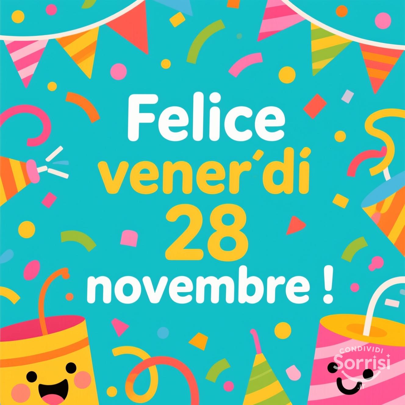 Felice Venerdì 28 Novembre! Immagine colorata e divertente per il venerdì. Auguri e festa con elementi grafici allegri. Ottimizzato per #venerdì #novembre #buonweekend #festa