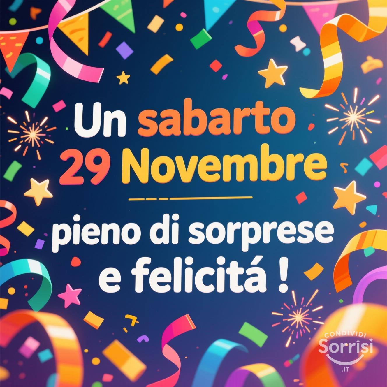 Immagine festosa: "Un sabato 29 novembre pieno di sorprese e felicità!". Grafica con coriandoli, stelle filanti e colori vivaci. Ideale per eventi, compleanni, celebrazioni e auguri.