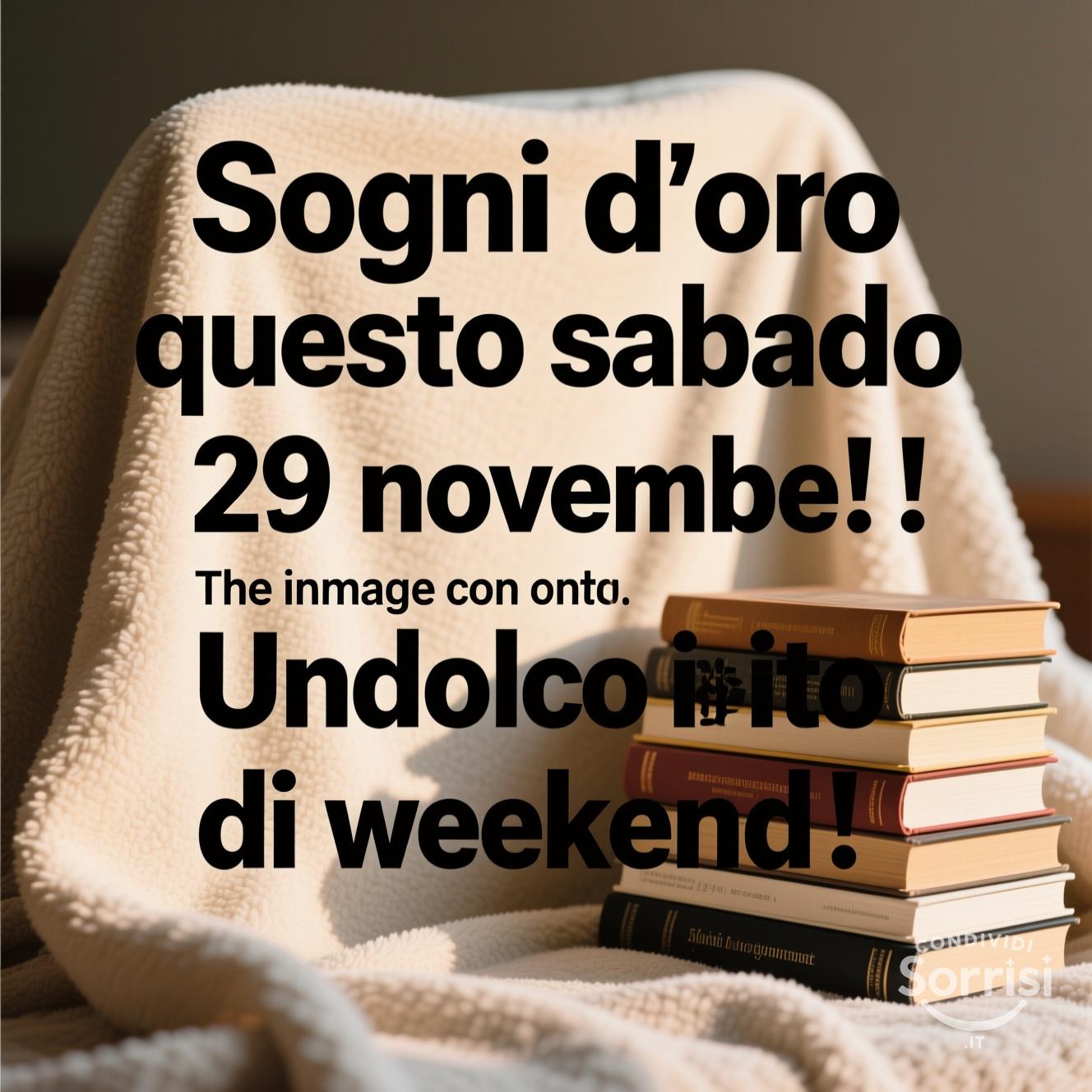 Immagine: "Sogni d'oro" sabato 29 novembre. Coperta, libri e frase in nero con font moderno. Dolce inizio weekend. SEO: Buonanotte, relax, weekend, libri, sogni, sabato.