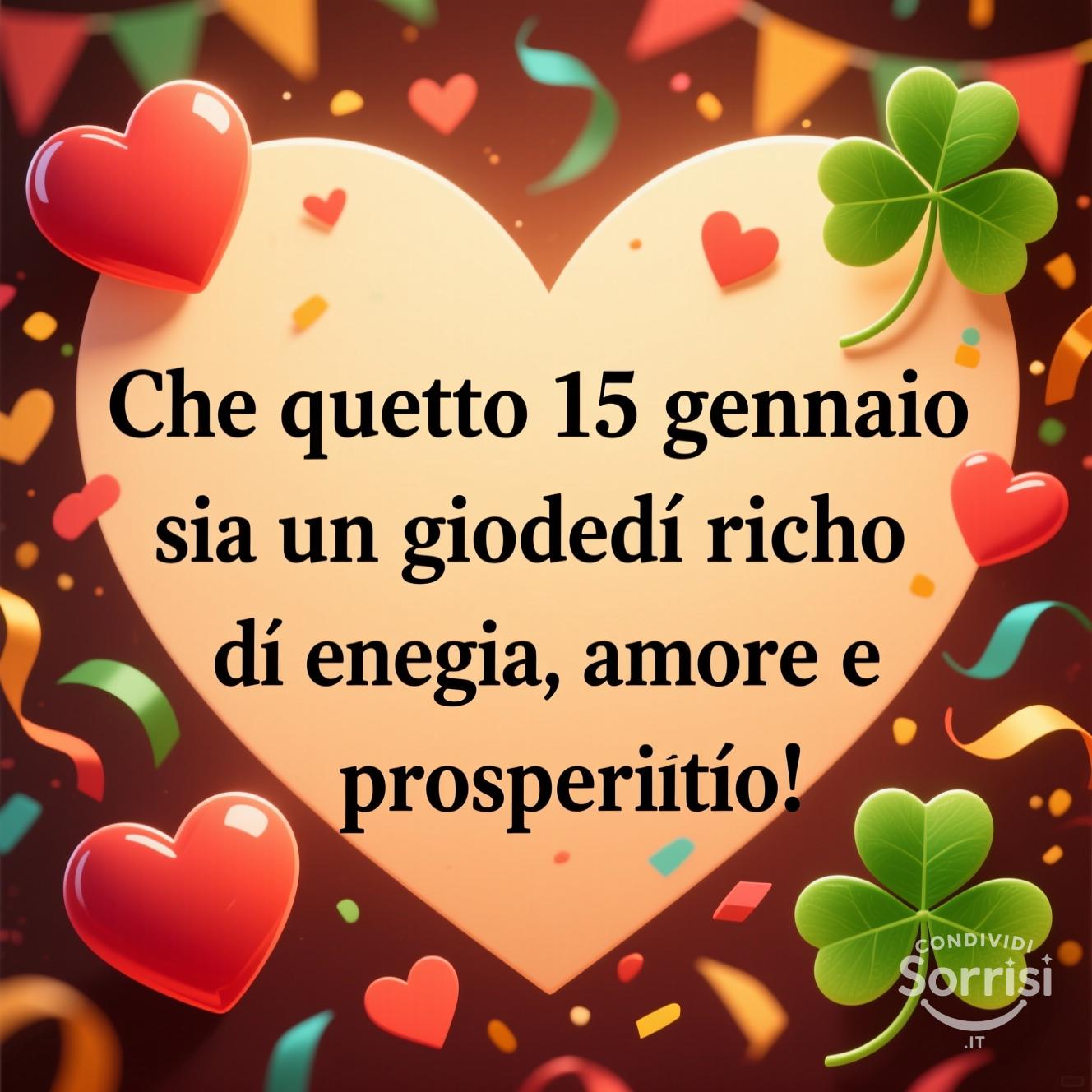 Immagine auguri 15 gennaio giovedì. Frase di buon auspicio con cuori, quadrifogli e colori caldi. Stile festoso e di buon augurio. Energia, amore e prosperità! #15gennaio #auguri #giovedì #buonanno