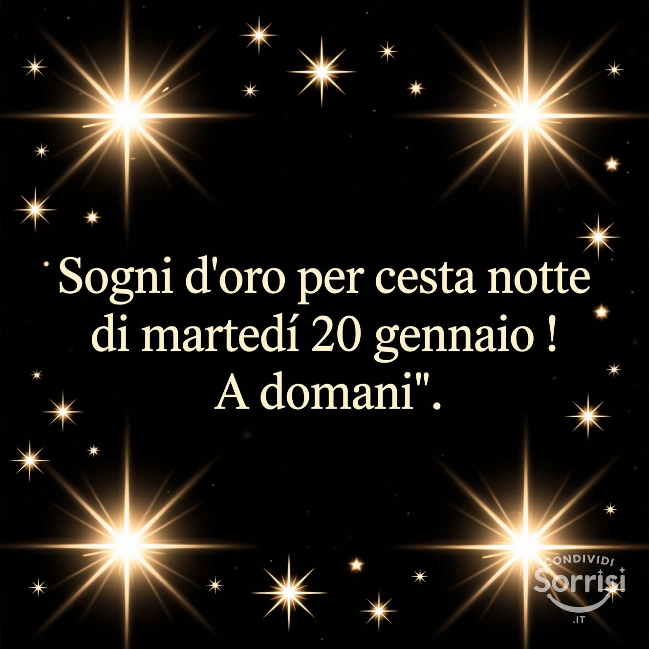 Immagine buonanotte martedì 20 gennaio: stelle brillanti nel cielo scuro. Frase "Sogni d'oro... a domani!" Testo elegante. Immagine serale per augurare sogni d'oro e buona notte.