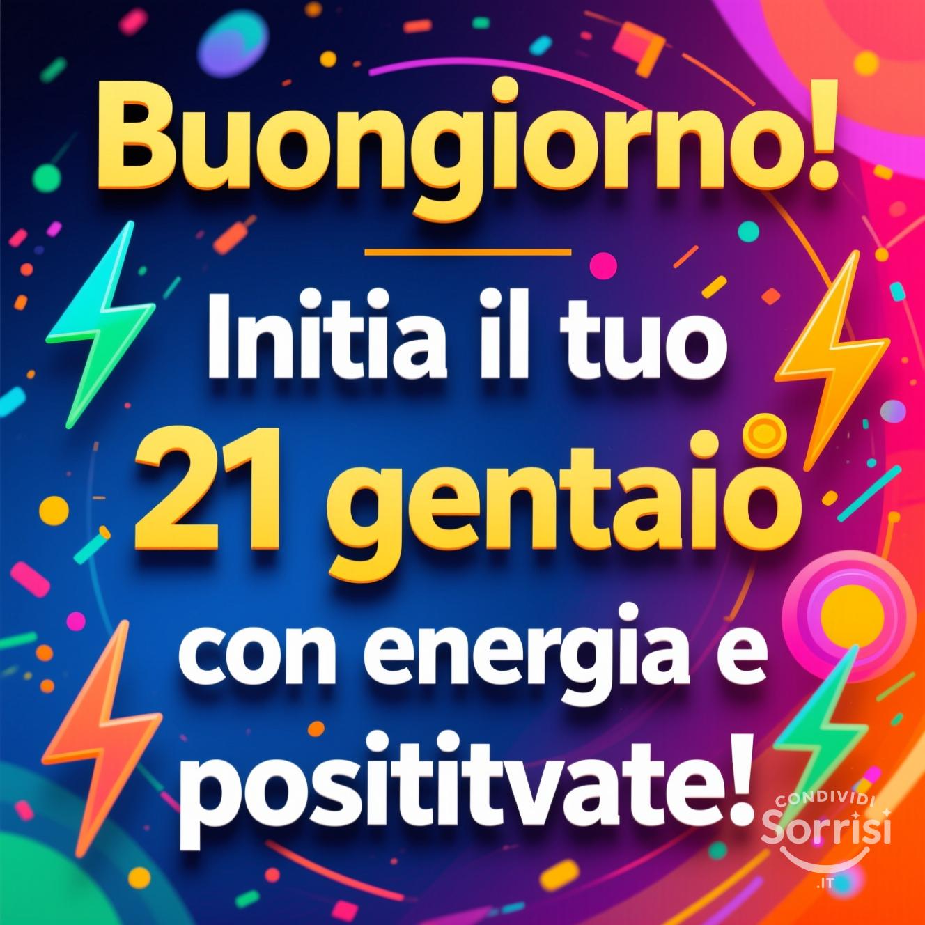 Buongiorno 21 Gennaio! Immagine motivazionale con frase positiva. Energie e positività per iniziare la giornata. Design vivace e colori accesi per un messaggio di buon auspicio.