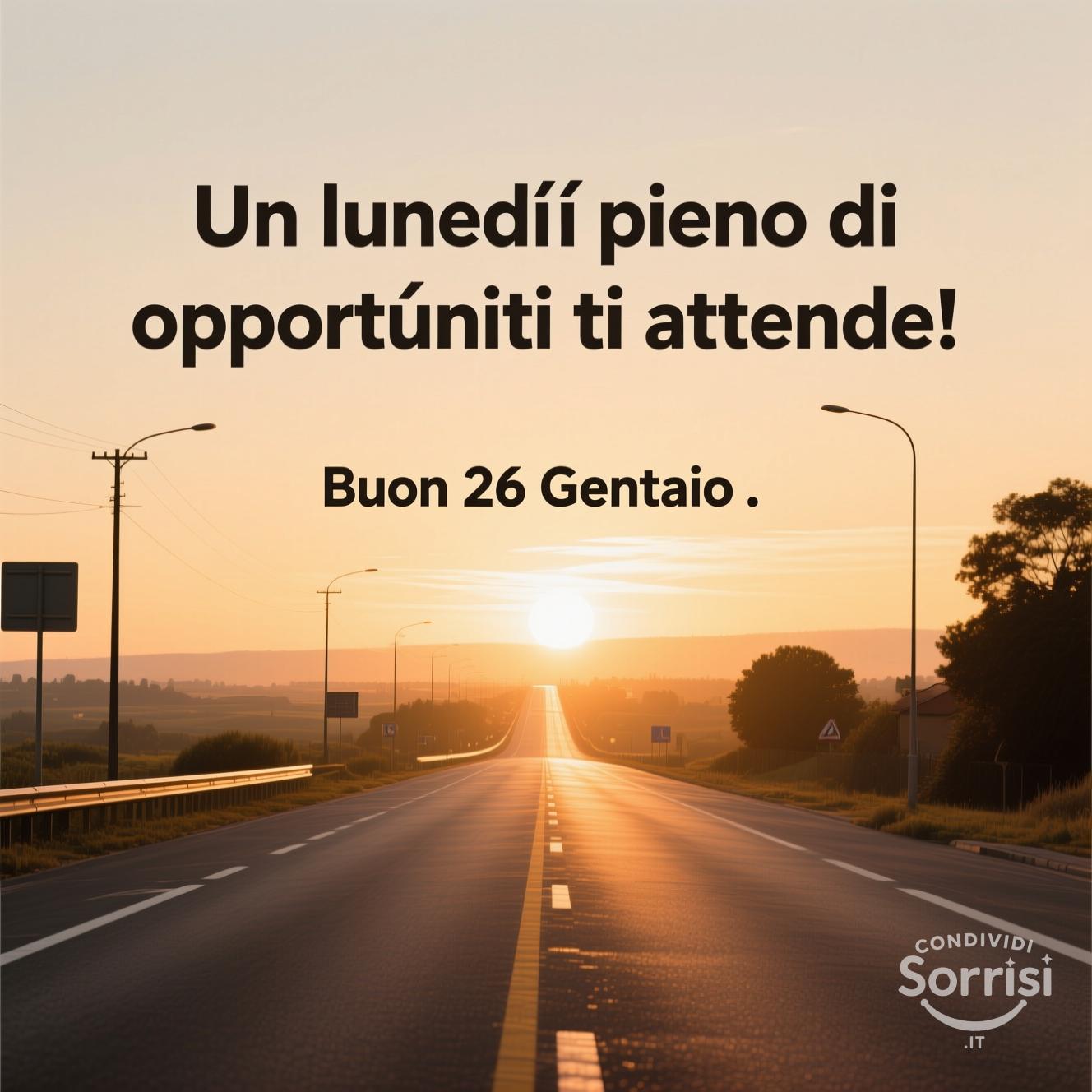 Buon 26 Gennaio! Immagine motivazionale con frase "Un lunedì pieno di opportunità ti attende". Strada verso l'orizzonte, luce calda, design minimalista. Ottimismo e buon inizio settimana!