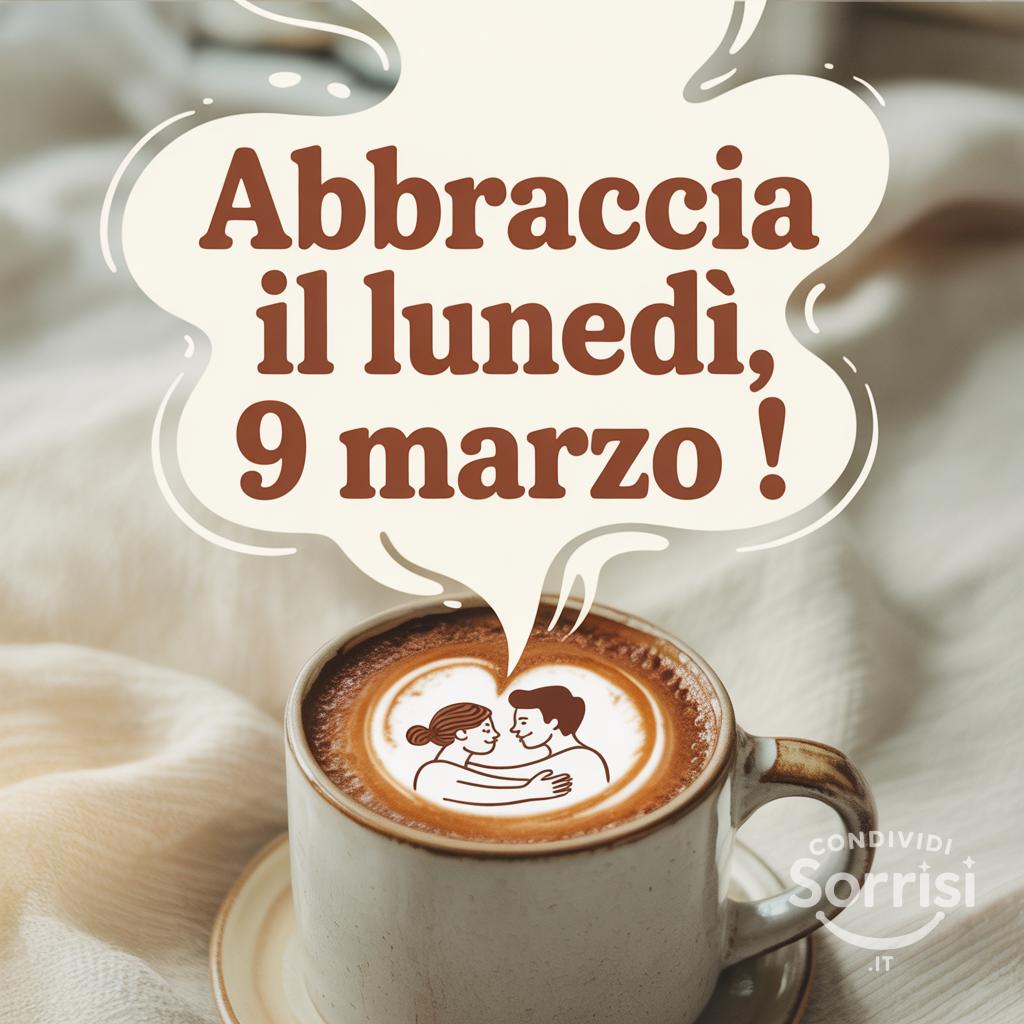 Abbraccia il lunedì! ☕️✨ Inizia la settimana con positività e calore. Un sorriso, una tazza fumante e tanta energia per affrontare ogni sfida. Buon 9 marzo! 😊