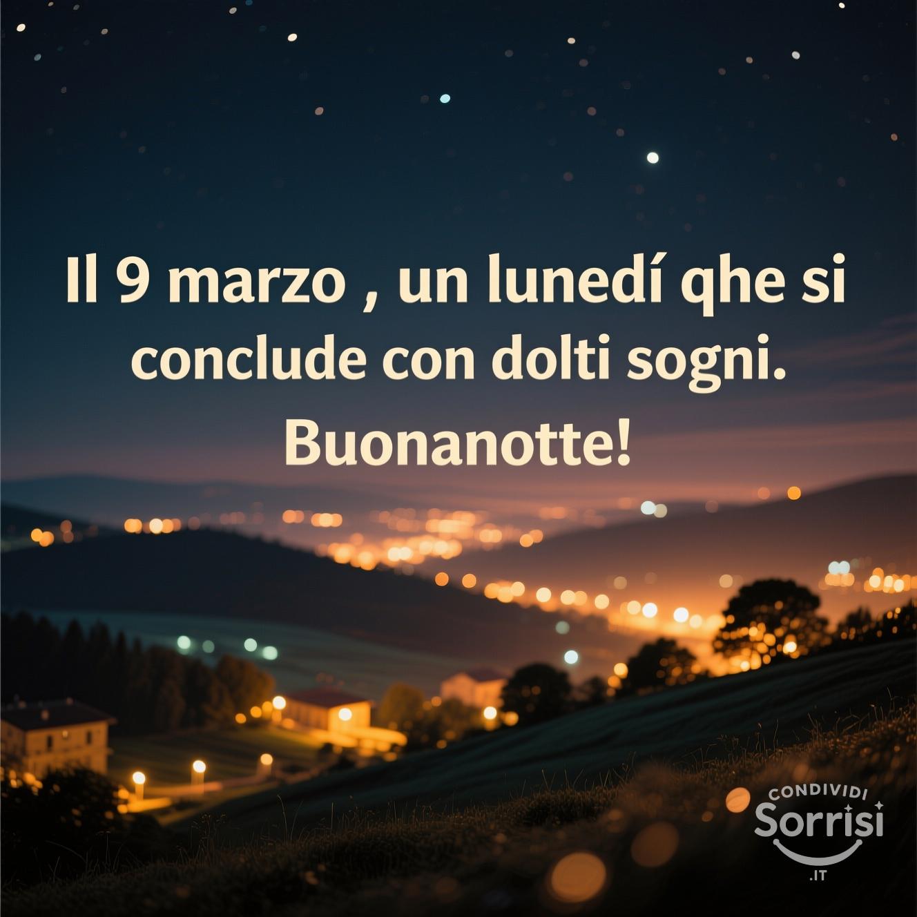 Immagine notturna con frase "Il 9 marzo... Buonanotte!". Paesaggio sereno con luci soffuse, colori caldi. Scena realistica per sogni d'oro.