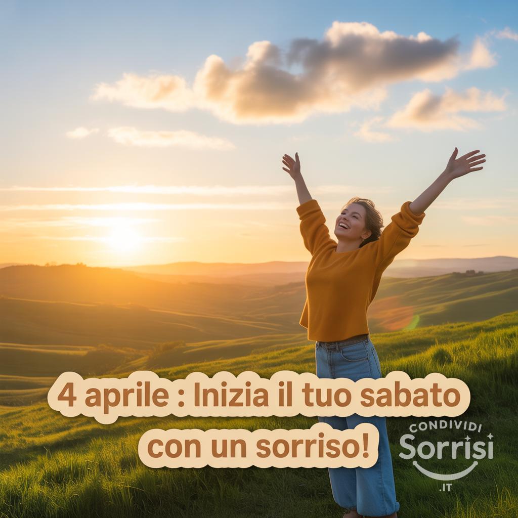 4 Aprile: inizia il tuo Sabato con un sorriso! ☀️ Lascia che il sole ti scaldi e alza le braccia al cielo per abbracciare la giornata. Buona giornata! 😊