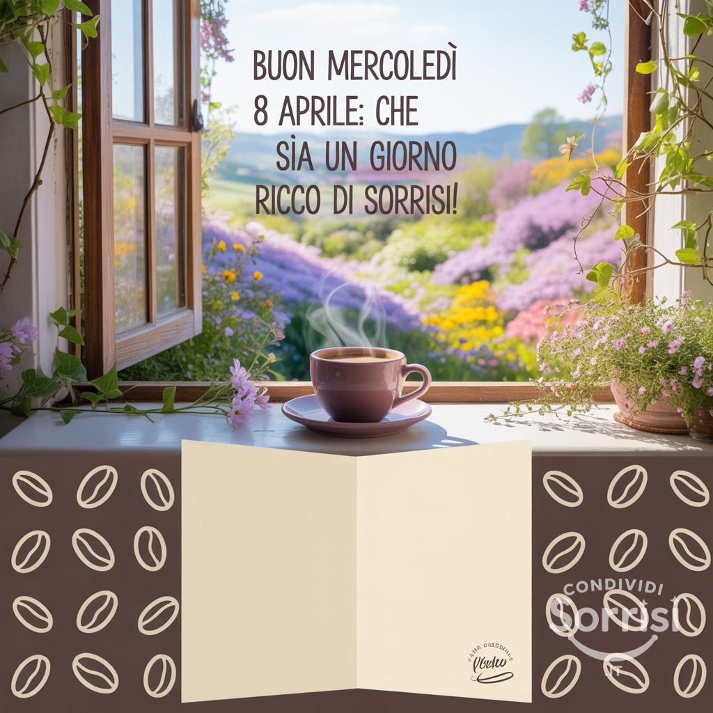 Buon Mercoledì 8 Aprile! ☀️ Che questo giorno porti con sé sorrisi e serenità, proprio come questa tazza fumante su un davanzale primaverile. Un abbraccio caldo per iniziare al meglio la giornata! #BuonMercoledì #Primavera #Sorrisi