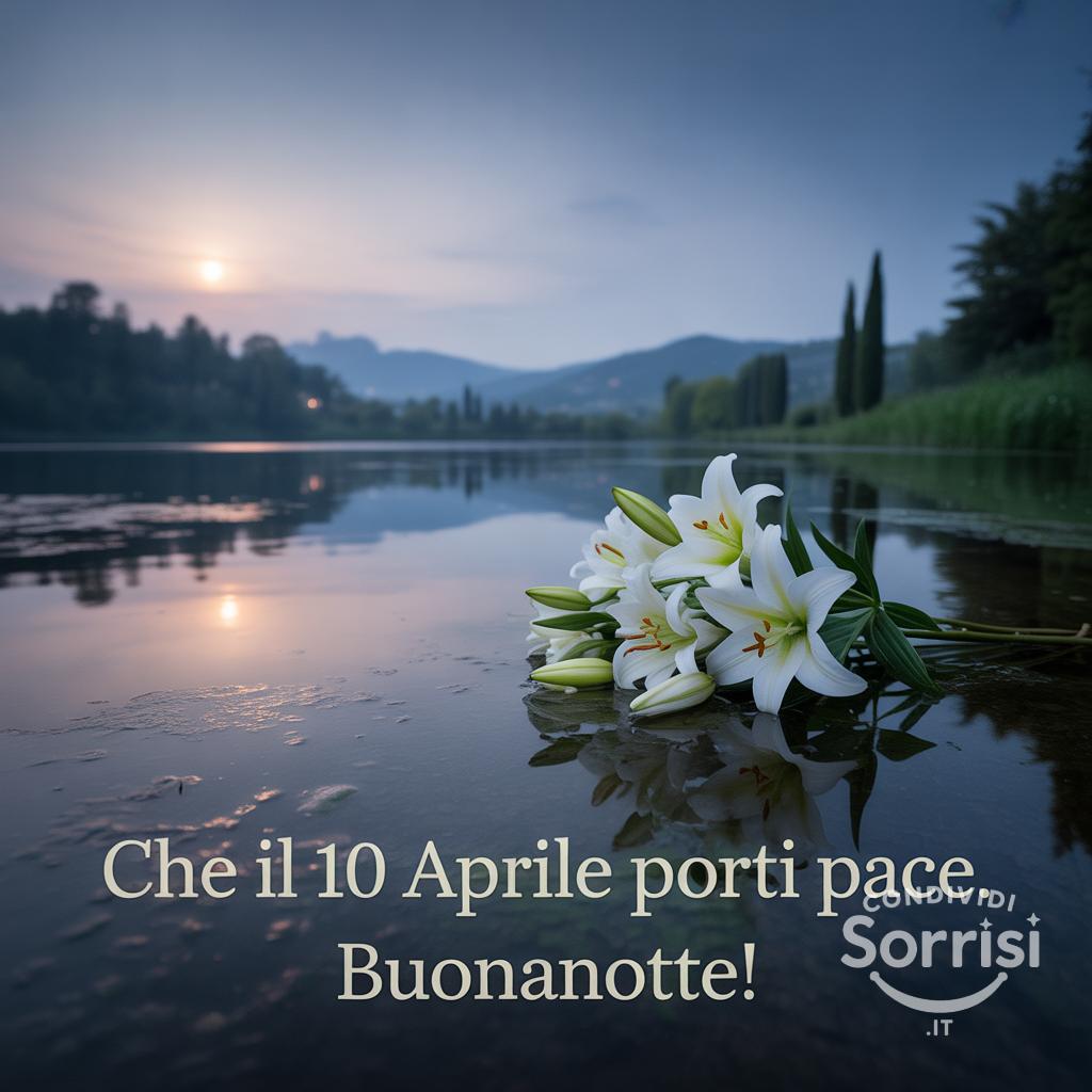 Che il 10 aprile porti pace. ✨ Buonanotte! 🌙 Un abbraccio di serenità dal lago calmo e fiori bianchi. 🌸