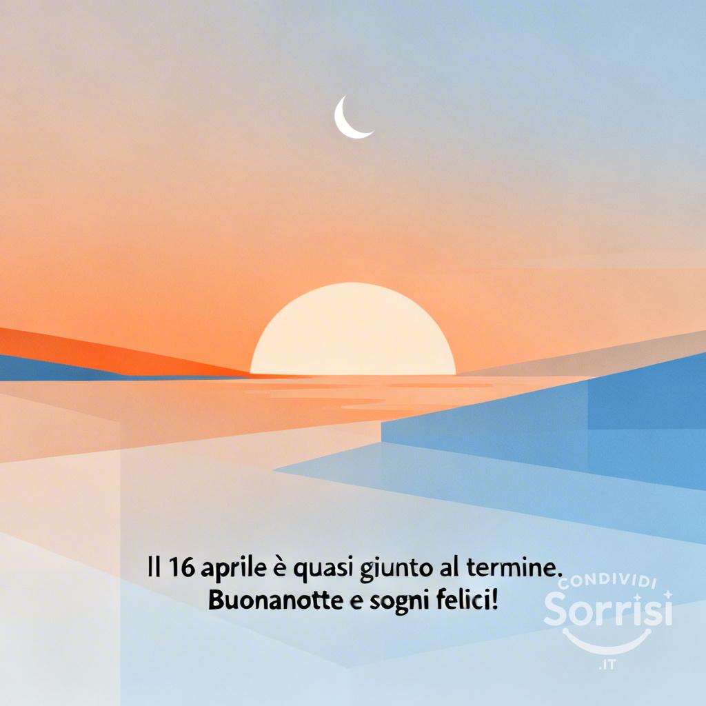Illustrazione minimalista: tramonto 16 aprile, sole calante, luna nascente. "Buonanotte e sogni felici!". Design pulito, transizione giorno-notte. SEO: tramonto, buonanotte, immagine minimalista.