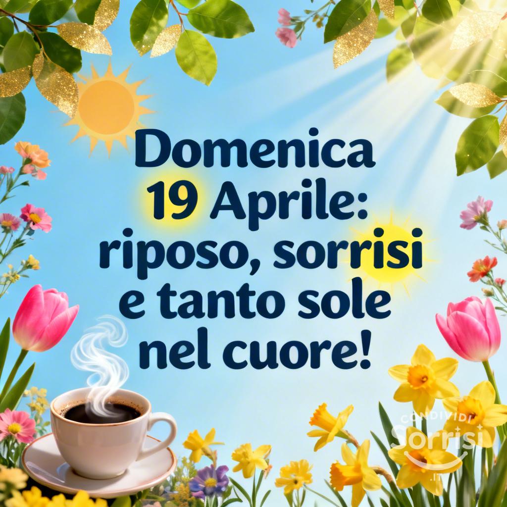 Domenica 19 Aprile: riposo, sorrisi, sole! Collage primaverile con fiori, caffè, raggi solari. Stile allegro, vivace. SEO: Pasqua 2023, vacanze, relax, primavera, gioia, sole, natura, weekend.