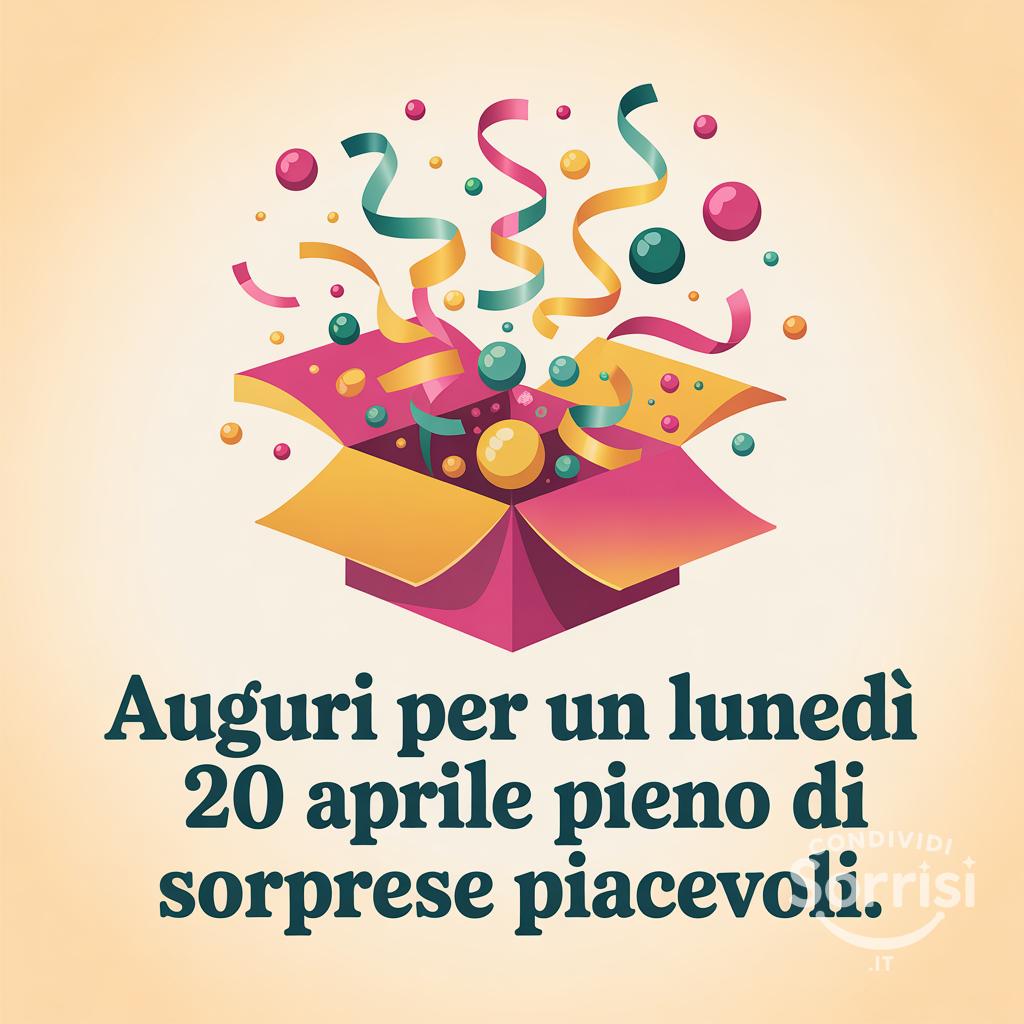 Buon lunedì 20 aprile! Che sia una giornata ricca di sorprese che ti portano gioia e sorrisi! 🎊✨