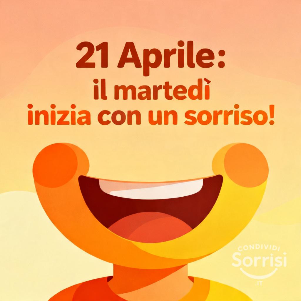 Grafica vivace, colori caldi: "21 Aprile: il martedì inizia con un sorriso!". Ottimizzato SEO: immagine di buon auspicio per un martedì di aprile, allegria digitale.