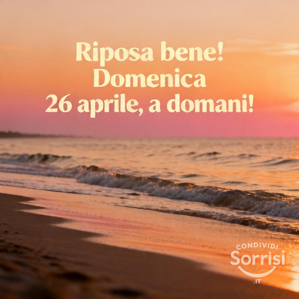 Spiaggia al tramonto: "Riposa bene! Domenica 26 aprile, a domani!". Colori caldi, onde rilassanti. Tranquillità e relax assicurati.