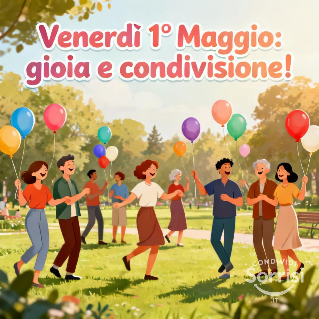 Venerdì 1 Maggio: gioia e condivisione! Illustrazione vivace di festa in parco, persone felici, palloncini, sorrisi. Stile amichevole e inclusivo per celebrare la Festa dei Lavoratori. #1Maggio #FestaLavoratori #Comunità #Celebrazione