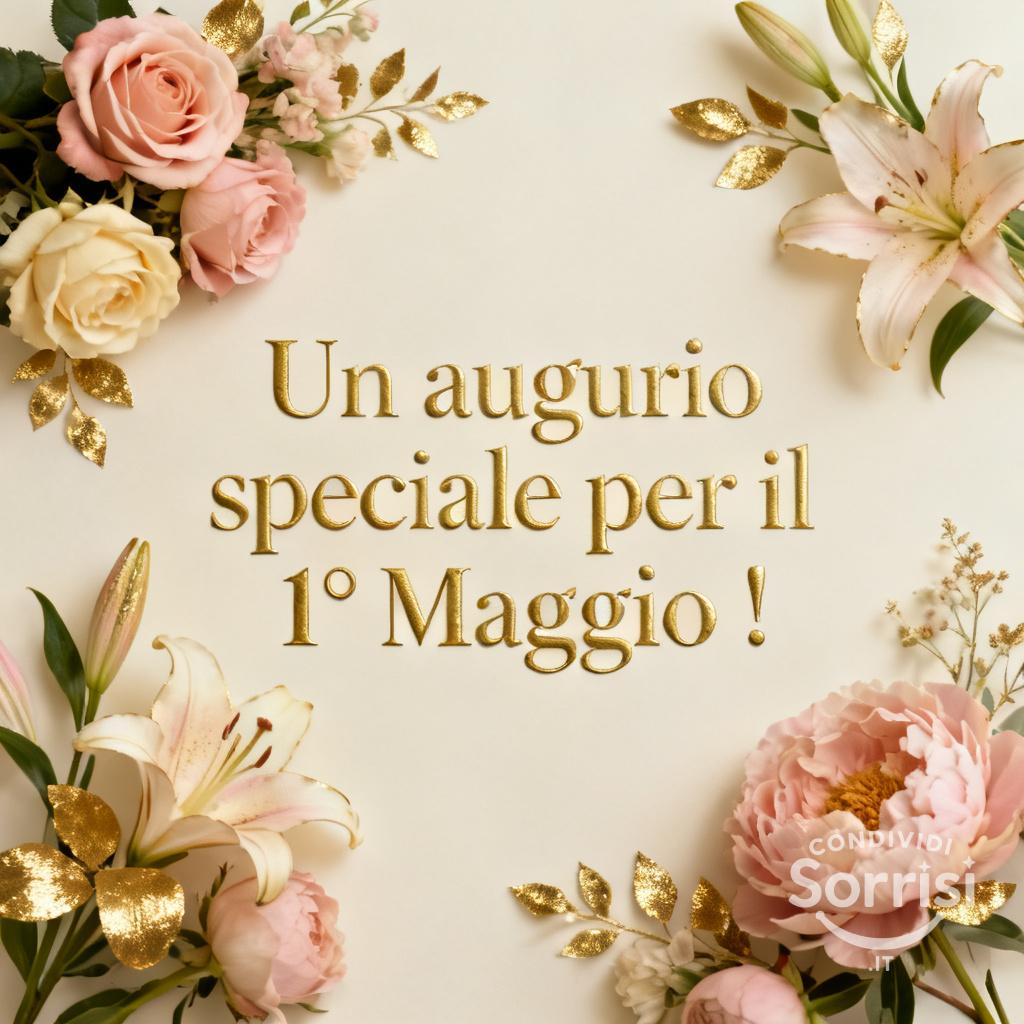Composizione floreale elegante con dettagli dorati. Augurio speciale per il 1° Maggio. Atmosfera raffinata e di festa. Idee regalo per la Festa dei Lavoratori.